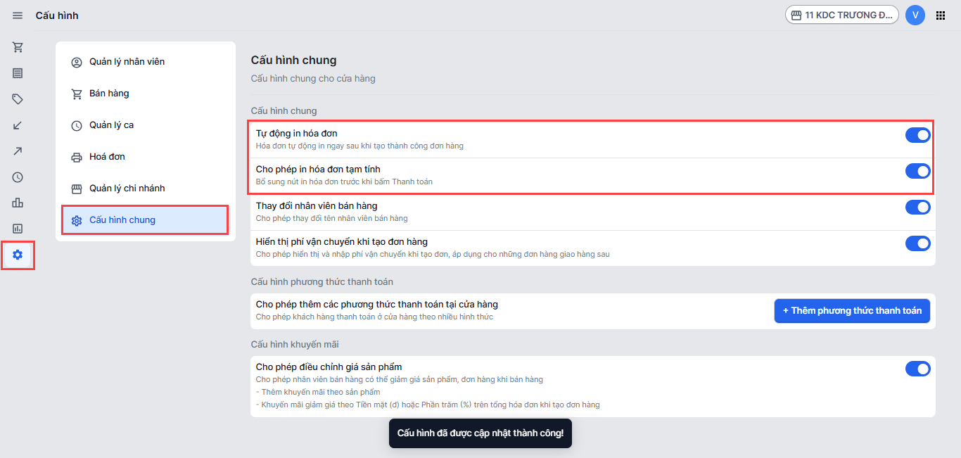 - Tự động in hóa đơn: Kích hoạt cấu hình này, hóa đơn sẽ được tự động in ngay khi tạo đơn hàng thành công.
