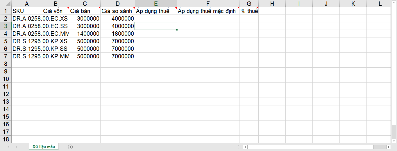 - Trên file mẫu sẽ có các thông tin SKU; Giá vốn; Giá bán; Giá so sánh; Áp dụng thuế; Áp dụng thuế mặc định; % thuế, nhà bán chỉ cần nhập các thông tin cần thiết là SKU, giá bán, giá so sánh.