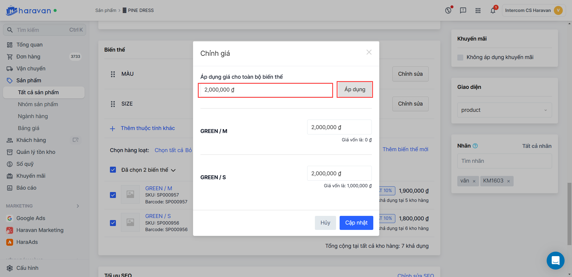 Hoặc bạn có thể nhập giá bán mới vào ô Áp dụng giá cho toàn bộ biến thể *(giá này sẽ được áp dụng cho toàn bộ biến thể)*và chọn Áp dụng