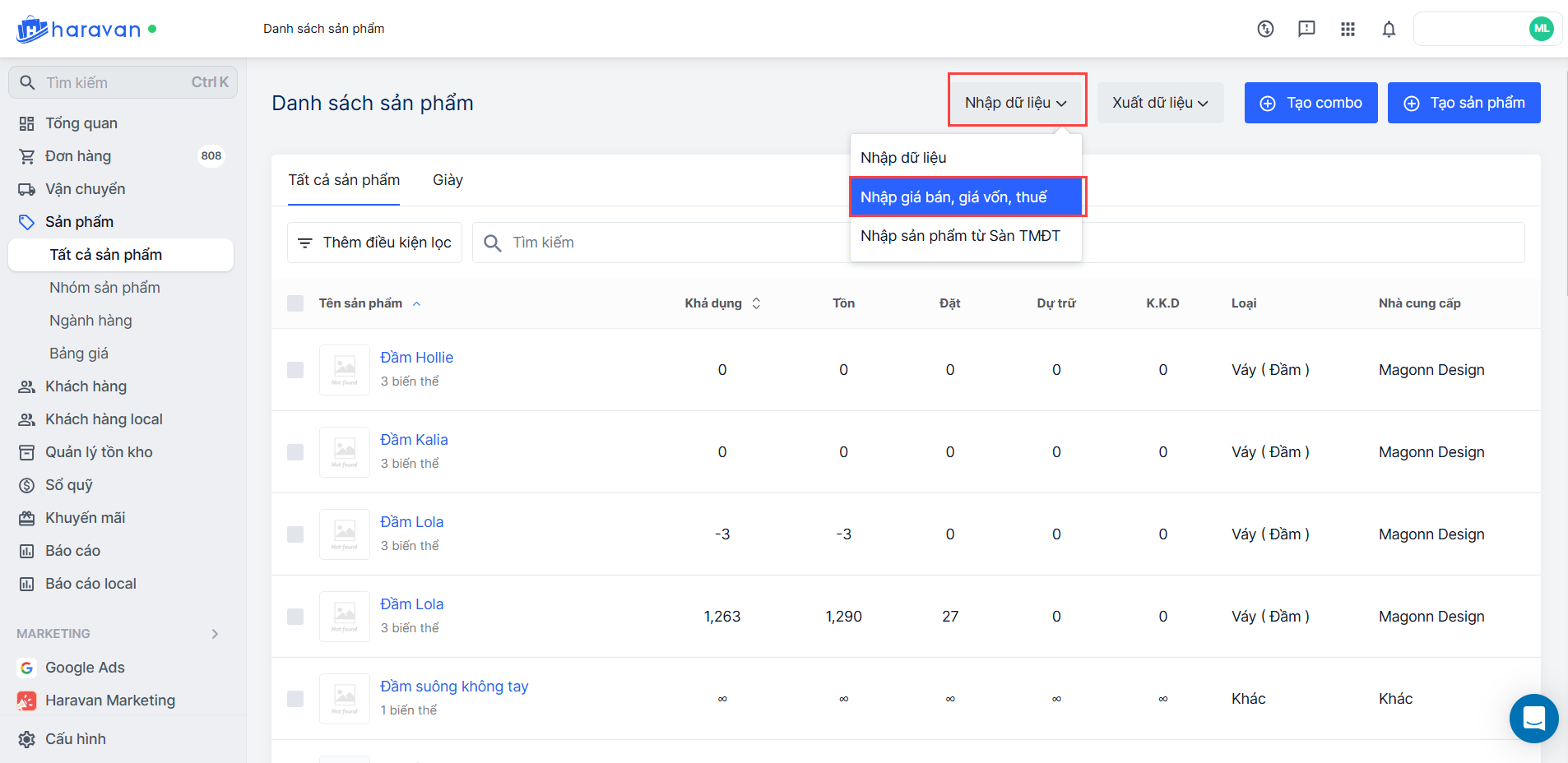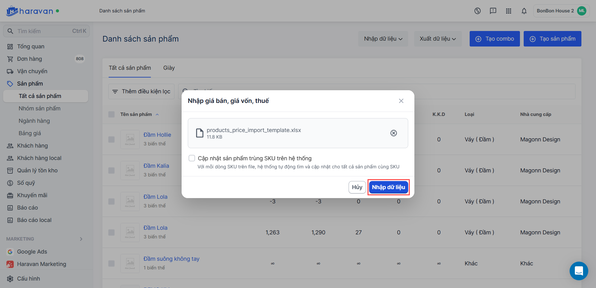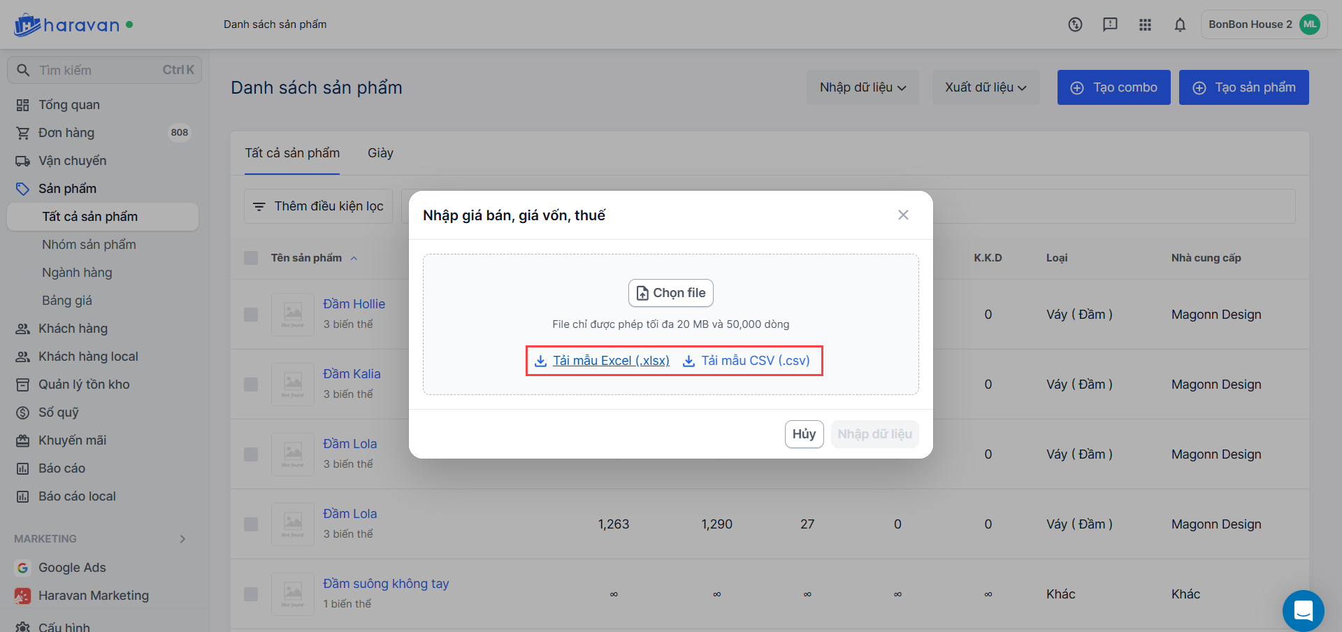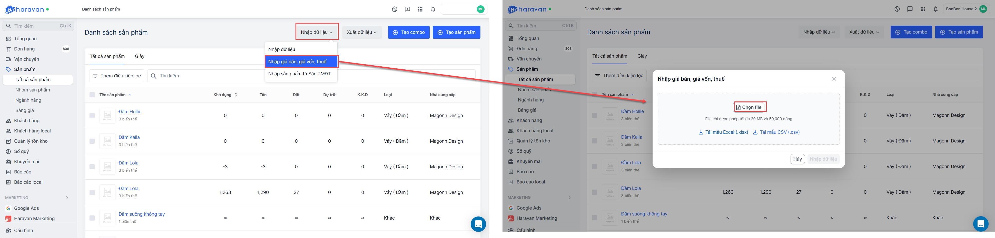 - Sau khi chỉnh sửa thì lưu lại file và quay về mục Sản phẩm trên admin MyHaravan để nhập lại file. Tại mục Nhập giá bán, giá vốn, thuế ,**bạn chọn **Chọn file và nhập file dữ liệu vừa chỉnh sửa.