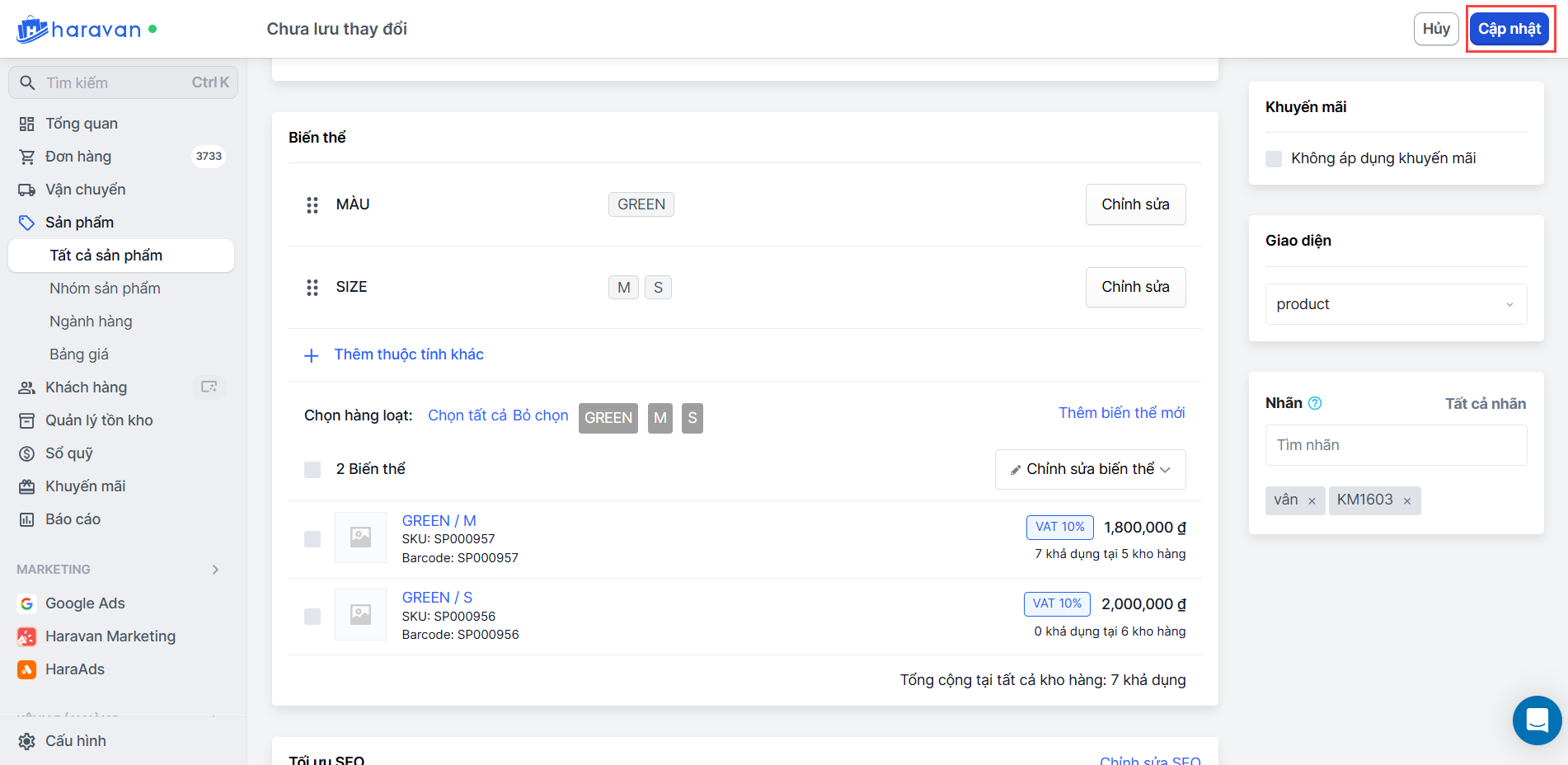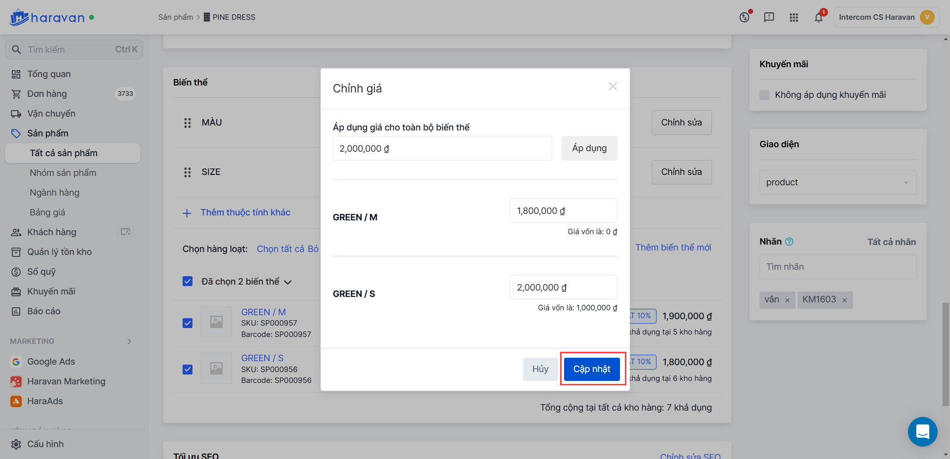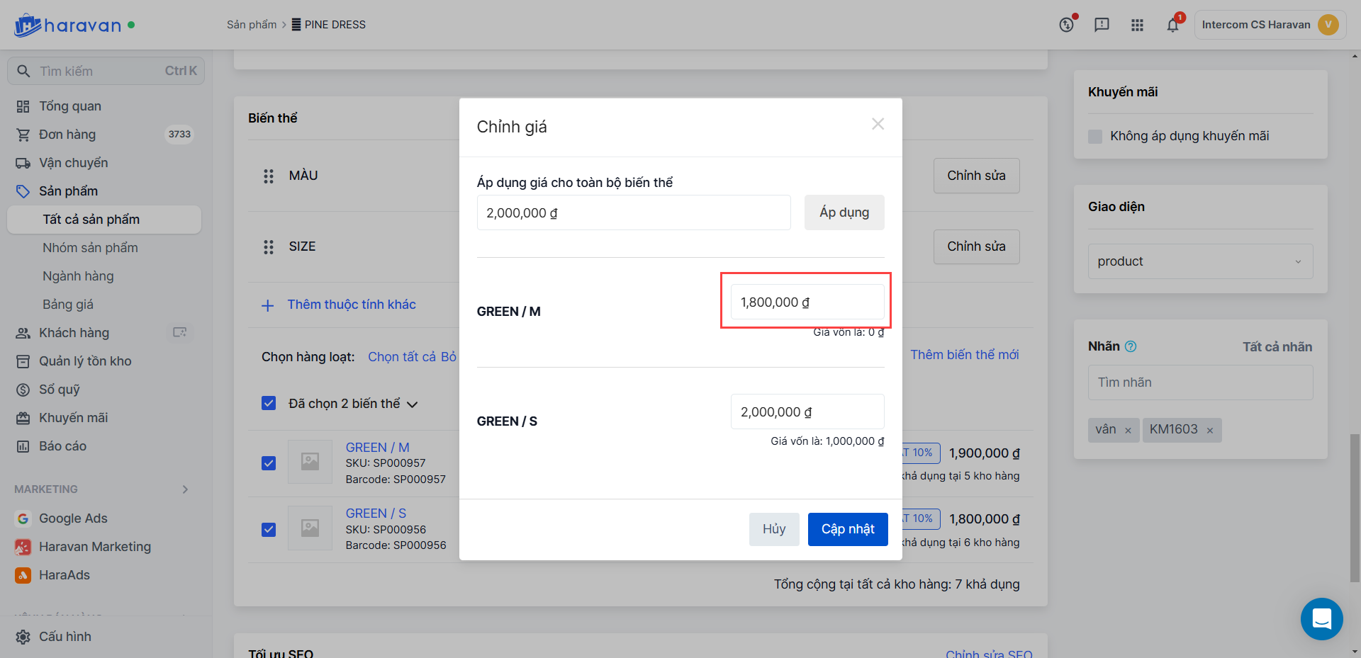 - Thực hiện nhập giá bán mới hoặc giá so sánh mới cho từng biến thể
