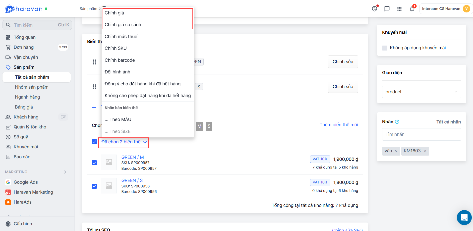 - Chọn chỉnh giá hoặc chỉnh giá so sánh