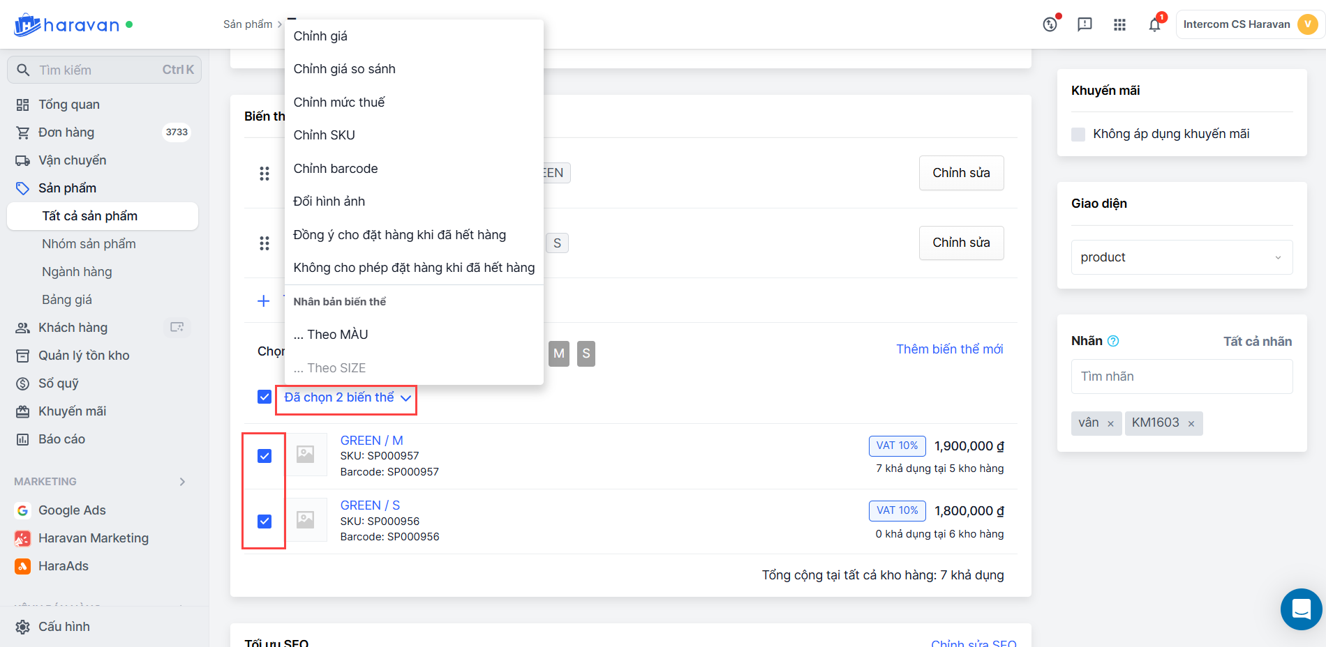 Chọn các biến thể cần cập nhật -> Chọn Đã chọn...biến thể