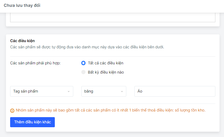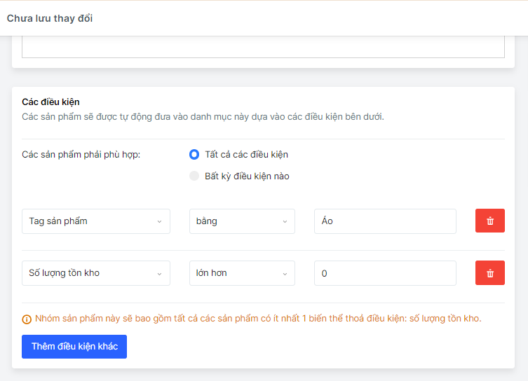 - Tất cả các điều kiện: Các sản phẩm phải có tất cả những điều kiện đã đặt ra mới được hệ thống tự cập nhật vào nhóm