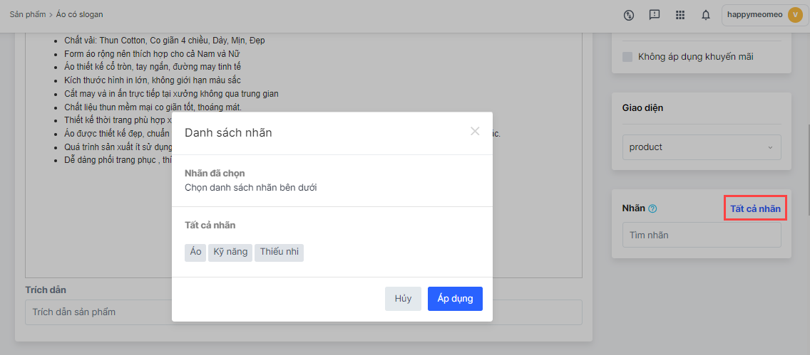 - Hoặc bấm vào Tất cả nhãnđể chọn nhãn gắn cho sản phẩm.