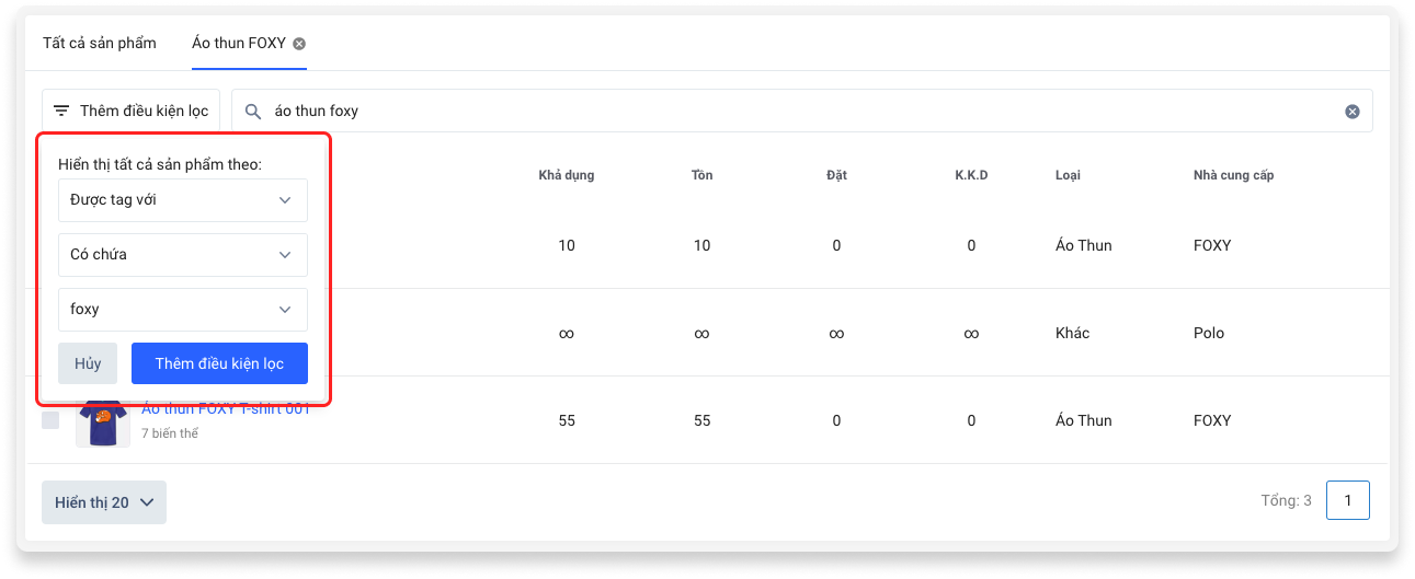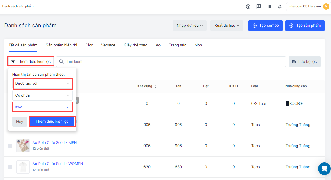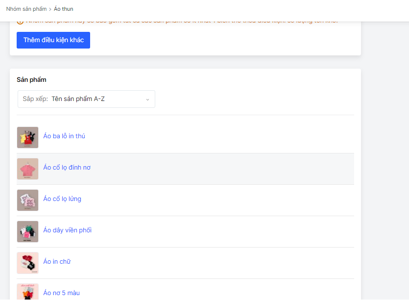 - Trong trang danh sách sản phẩm, chọn Thêm điều kiện lọc