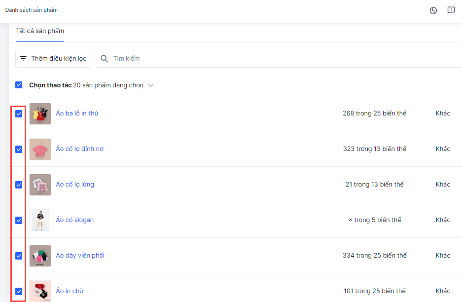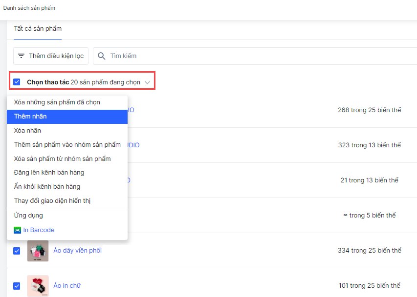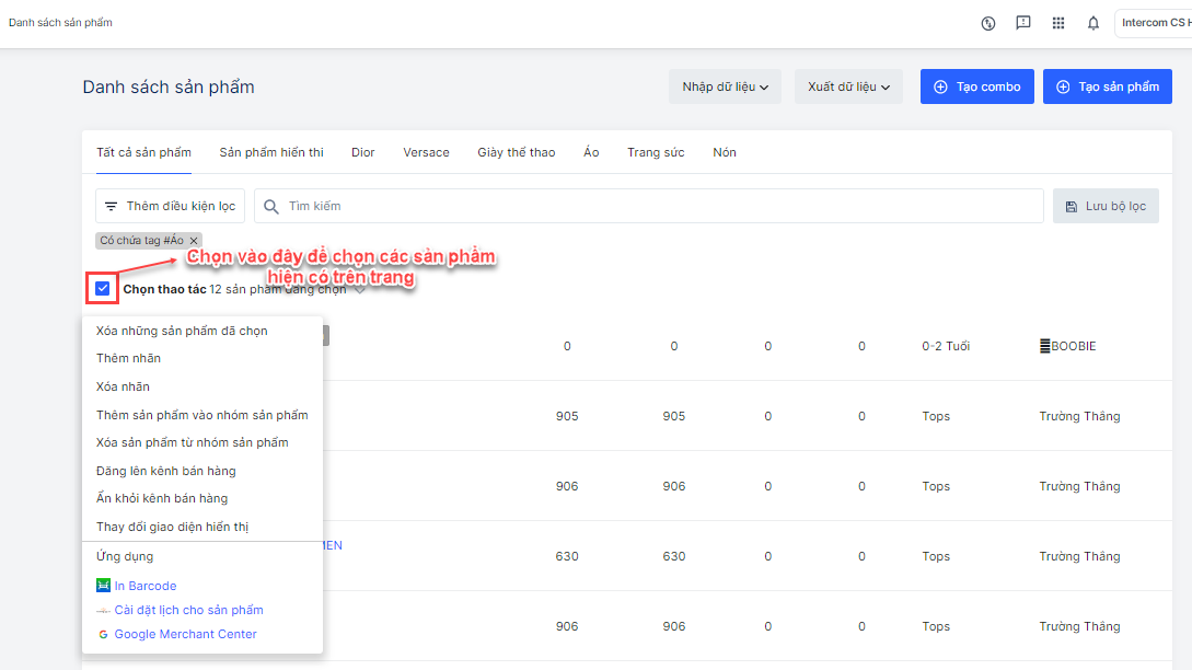 - Trong trang danh sách sản phẩm, đánh dấu chọn các sản phẩm bạn muốn thêm tag