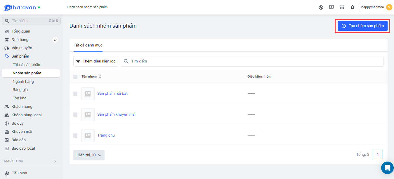 - Trước khi tạo nhóm sản phẩm theo điều kiện nhãn sản phẩm, bạn cần gắn nhãn các sản phẩm. Sau khi đã gắn nhãn xong, trong mục Nhóm sản phẩm, bạn chọn Tạo nhóm sản phẩm.
