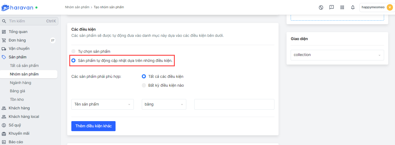 - Mục Các điều kiện, bạn chọn Sản phẩm tự động cập nhật dựa trên những điều kiện.