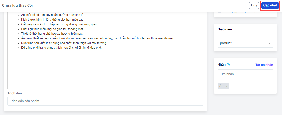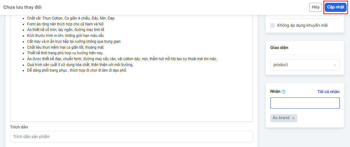 4. Nhấn Cập nhật để lưu lại thiết lập tag sản phẩm