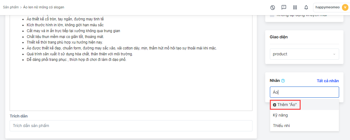 Tại trang chi tiết sản phẩm, bạn nhập tên nhãn sản phẩm mới tại mục Nhãn, chọn **+ Thêm "tên nhãn mới"**để tạo nhãn mới.