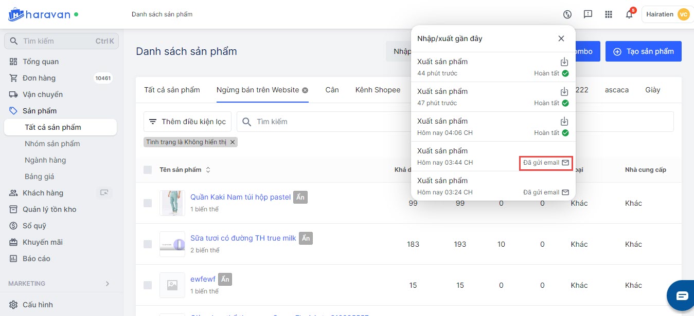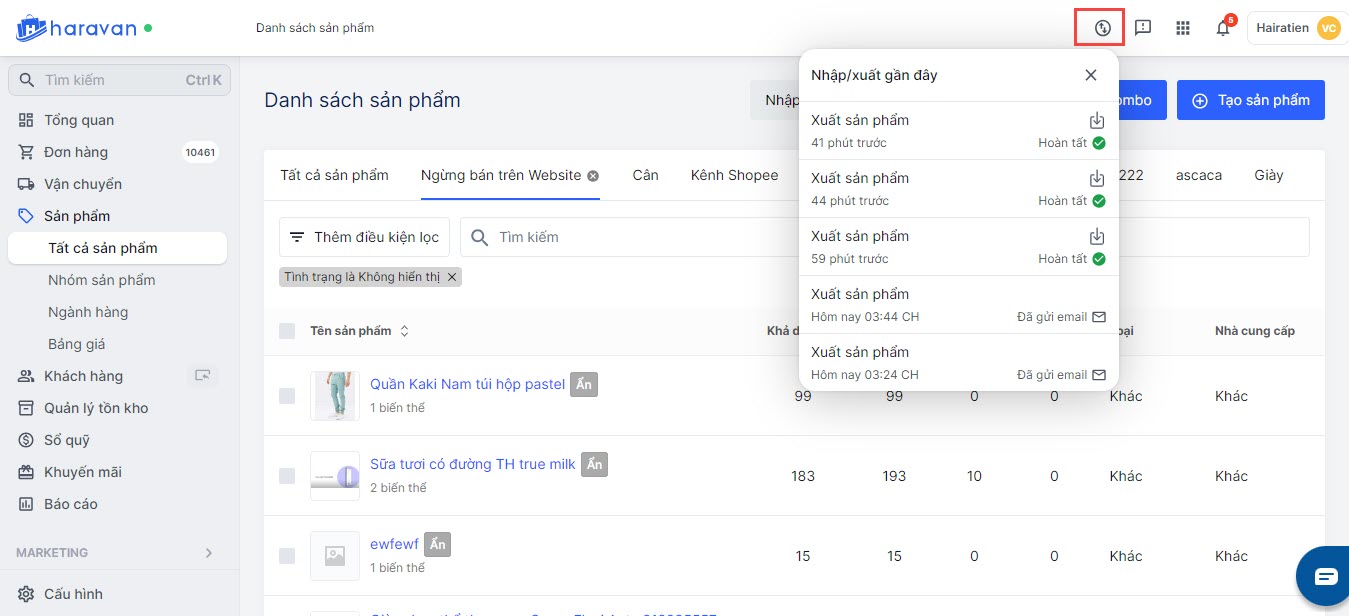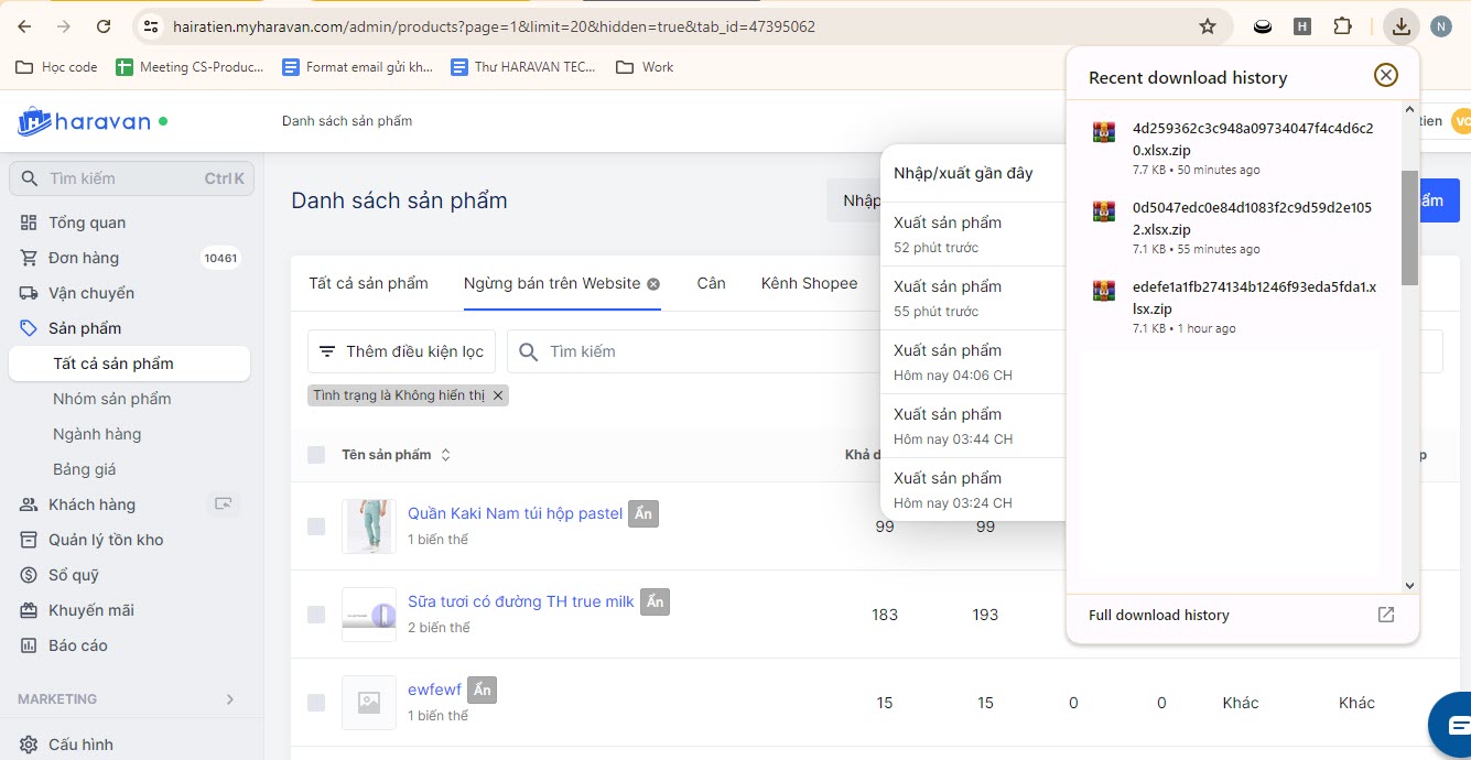 - Nhà bán hàng kiểm tra tình trạng tải file trong thông báo xuất file trên trang admin.
