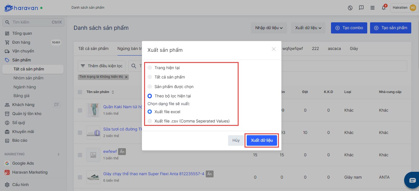 - Chọn Sản phẩm cần xuất và định dạng file mong muốn (Không thể chọn định dạng file khi xuất dữ liệu theo mẫu Shopee) -> chọn Xuất dữ liệu