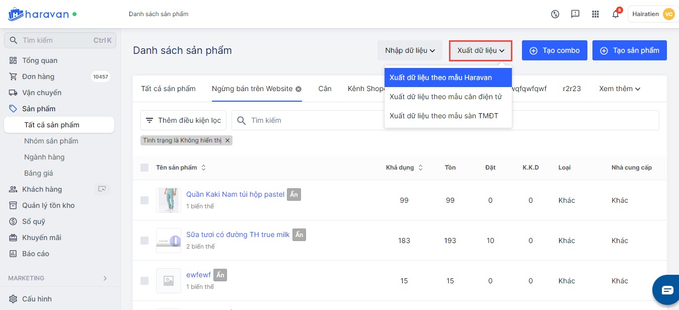 Chọn Xuất dữ liệu và chọn Xuất dữ liệu theo mẫu Haravan/theo mẫu cân điện tử/mẫu sàn TMĐT