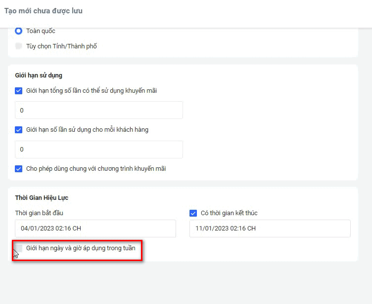 Tại mục Thời gian hiệu lực, bạn chọn Giới hạn ngày và giờ áp dụng trong tuần, sau đó bạn chọn ngày giờ và thêm khung giờ sẽ được áp dụng khuyến mãi.