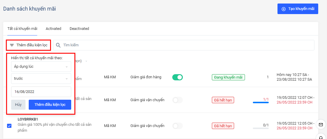 - Nếu có nhiều khuyến mãi, người bán có thể sử dụng thanh Tìm kiếm hoặc Thêm điều kiện lọc để tìm khuyến mãi mình muốn.