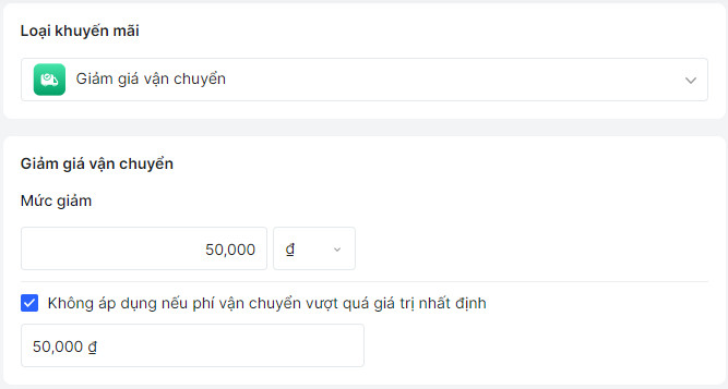 - Có thể thiết lập Không áp dụng mã khuyến mãi nếu phí vận chuyển vượt quá giá trị đã thiết lập