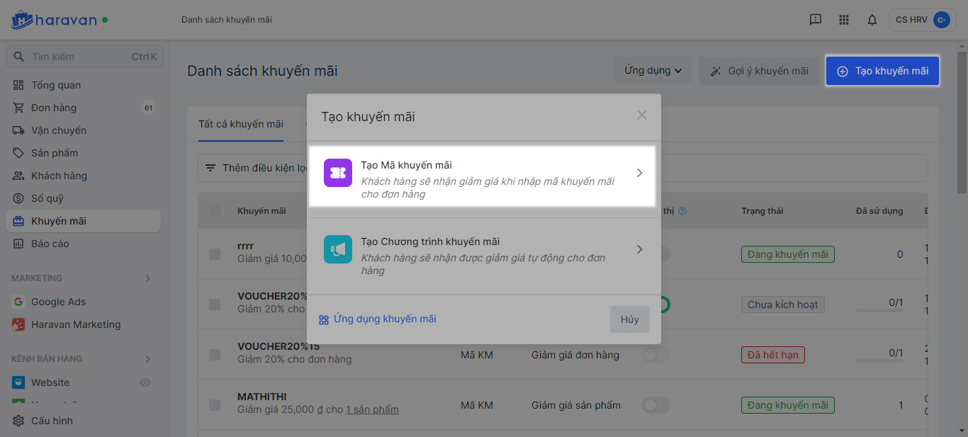 Haravan sẽ hỗ trợ nhà bán hàng tạo các loại mã khuyến mãi như: