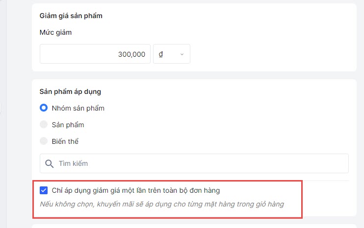 - Với thiết lập giảm giá sản phẩm theo số tiền nhất định, bạn sẽ có thể thiết lập giảm giá một lần trên toàn bộ đơn hàng. Nếu không chọn, số tiền khuyến mãi đã thiết lập sẽ được giảm cho từng sản phẩm đạt điều kiện trong giỏ hàng