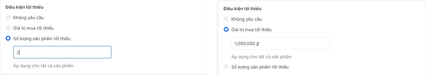- Số lượng mua tối thiểu: Số lượng sản phẩm cần đạt được để áp dụng khuyến mãi