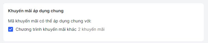 - Thiết lập mã khuyến mãi áp dụng chung với chương trình khuyến mãi. Khi bỏ tick chọn thiết lập này, mã khuyến mãi sẽ không được áp dụng chung với khuyến mãi của các app như Combo, Mua X được Y và các chương trình khuyến mãi.