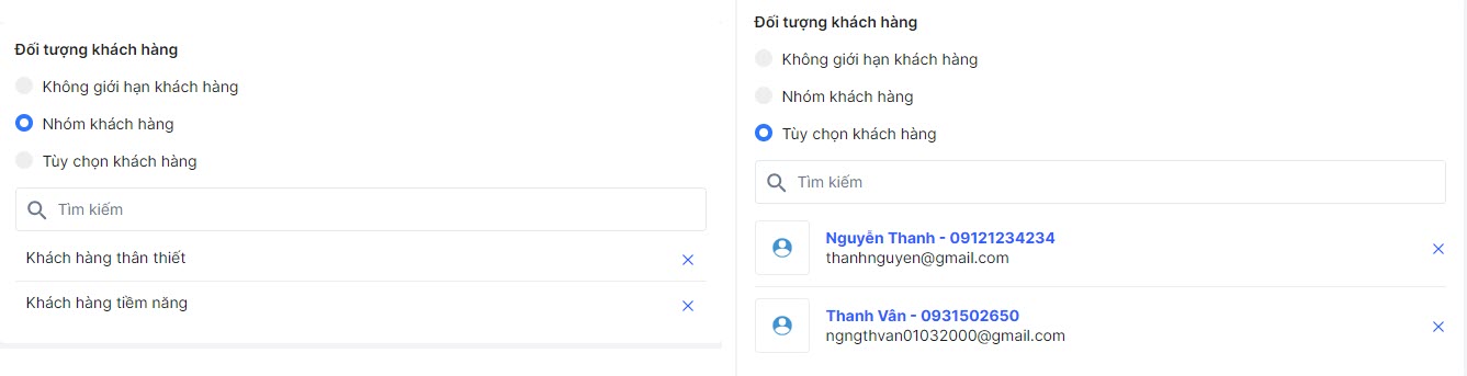 - Tùy chọn khách hàng: Áp dụng cho khách hàng cụ thể (có thể chọn nhiều khách hàng)