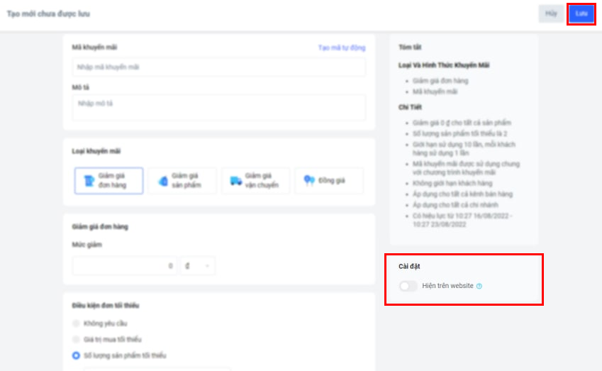 - Thiết lập Hiện trên website: Hiển thị mã khuyến mãi hiển thị trên website (Giới hạn tối đã hiển thị 10 mã khuyến mãi được tạo gần nhất). Chọn Lưuđể hoàn tất.