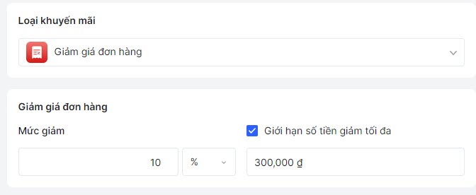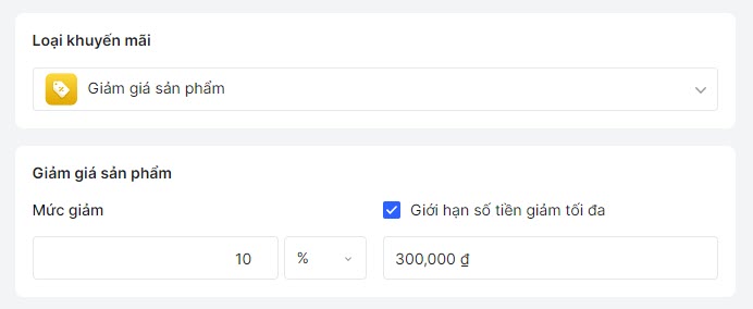 - Giảm theo giá trị nhất định hoặc giảm theo % (có thể thiết lập số tiền tối đa có thể giảm)