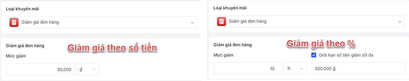 - Giảm theo số tiền nhất định hoặc giảm theo % (có thể thiết lập số tiền tối đa có thể giảm)