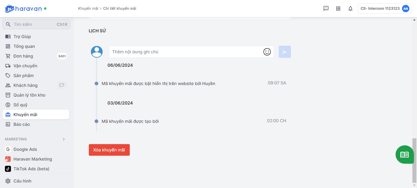 Để kiểm tra Lịch sử thao tác của nhân viên trên mã khuyến mãi, nhà bán hàng vào trang Chi tiết khuyến mãi, đến mục Lịch sử.