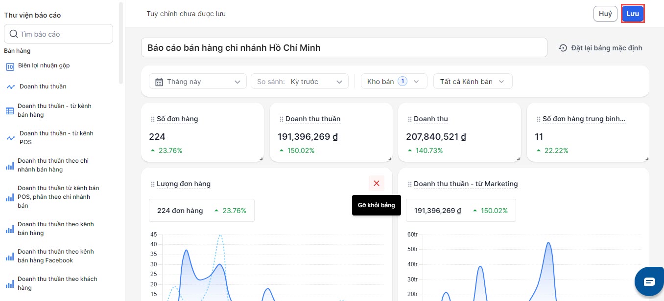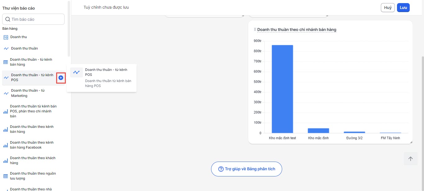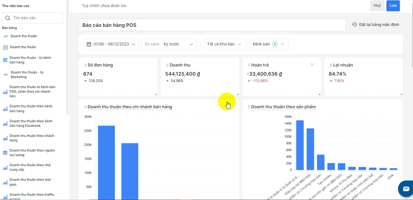 | Biểu đồ cột dọc | _ Doanh thu thuần theo chi nhánh bán hàng _ Doanh thu thuần từ kênh bán POS, phân theo chi nhánh bán hàng _ Doanh thu thuần theo kênh bán hàng _ Doanh thu thuần theo kênh bán hàng Facebook _ Doanh thu thuần theo khách hàng _ Doanh thu thuần theo nhà cung cấp _ Doanh thu thuần theo nhân viên bán hàng _ Doanh thu thuần theo sản phẩm _ Doanh thu thuần theo thời gian _ Doanh thu thuần theo traffic source _ Doanh thu thuần theo vùng _ Pageviews | |