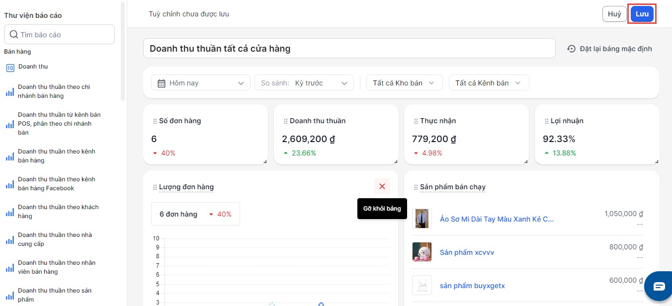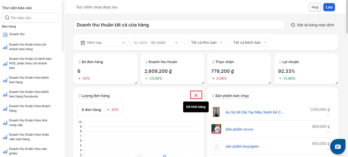 - Để xóa báo cáo, bạn chọn vào biểu tượng x để xóa báo cáo khỏi Bảng phân tích.