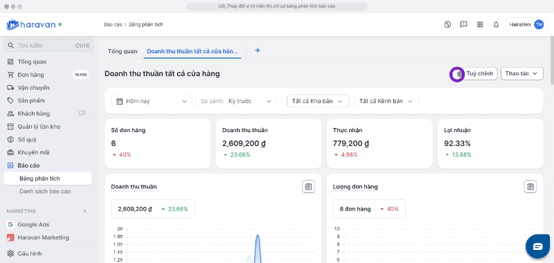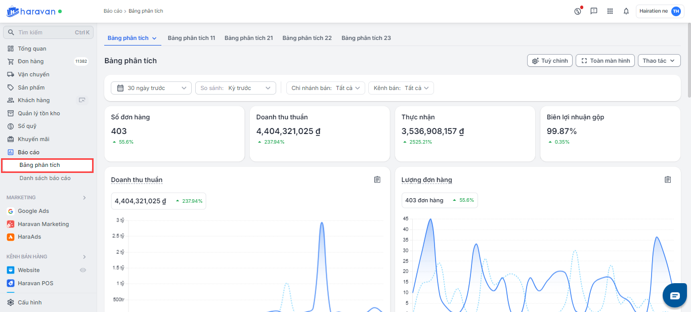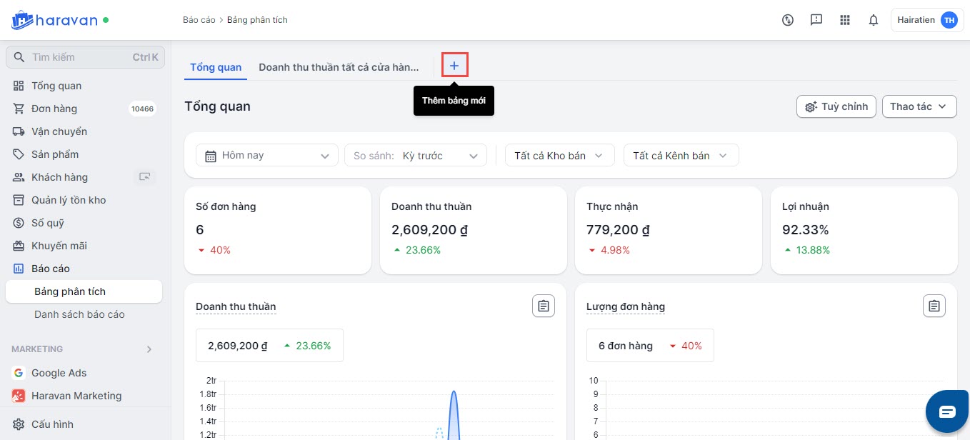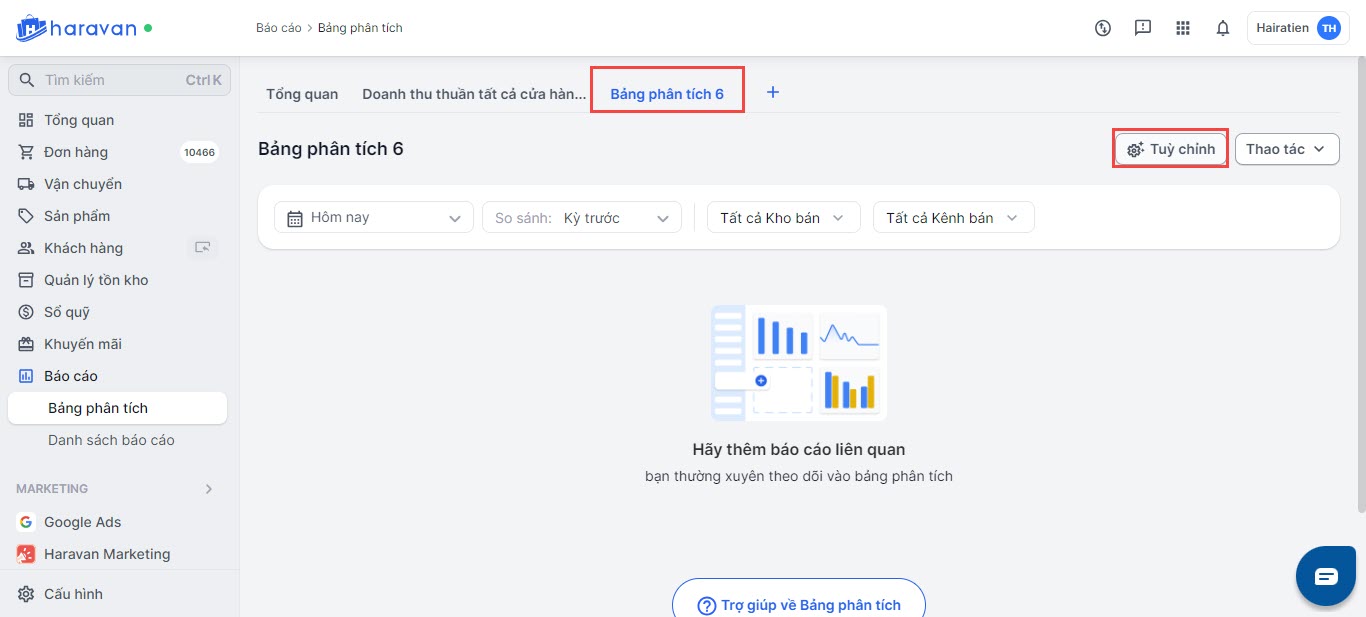 Các báo cáo trong Haravan cung cấp dữ liệu chi tiết cho từng khía cạnh của hoạt động kinh doanh, nhưng để có cái nhìn tổng thể, nhà bán thường phải mở và lọc nhiều báo cáo riêng lẻ. Để nâng cấp trải nghiệm quản lý, Haravan ra mắt Bảng Phân Tích, giúp nhà bán tự tạo bảng tổng quan, tập hợp các chỉ số quan trọng chỉ trong một giao diện duy nhất. Mỗi bảng tổng quan chỉ hiển thị trên tài khoản của người đã tạo, đảm bảo tính cá nhân hóa và giúp người dùng tập trung vào các số liệu quan trọng đối với họ mà không bị ảnh hưởng bởi các tài khoản khác trong hệ thống quản trị.