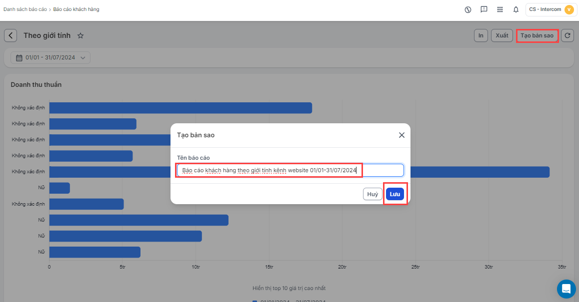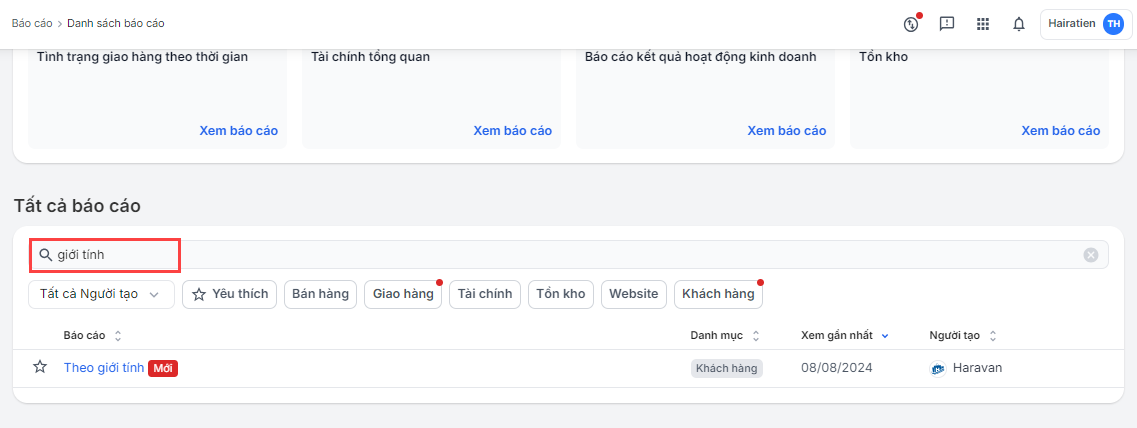 Hướng dẫn xem báo cáo khách hàng theo giới tính