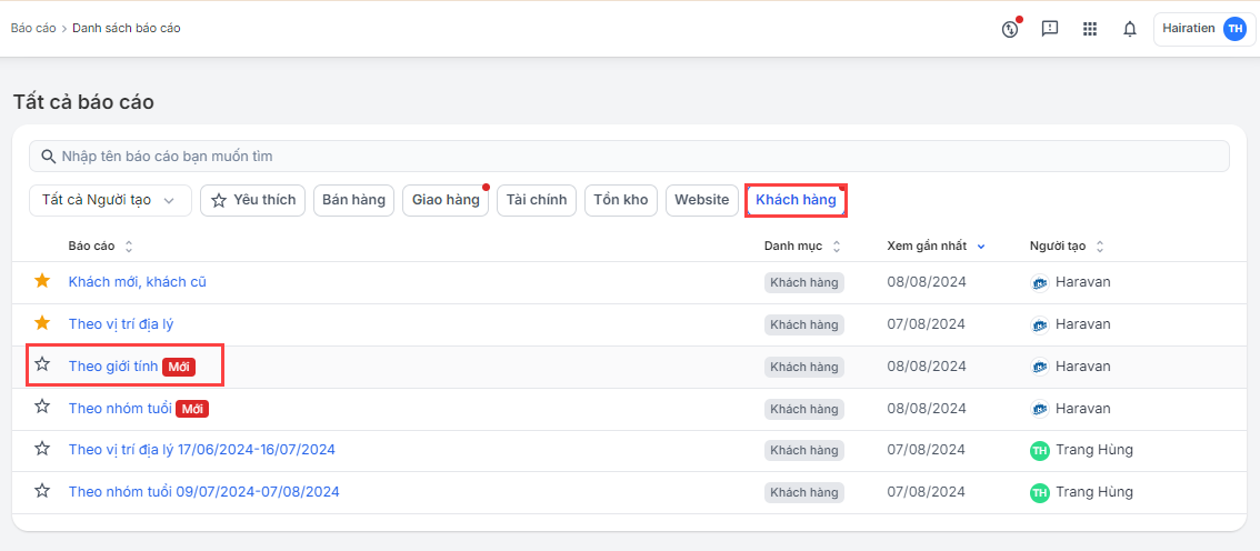 Báo cáo khách hàng theo nhóm giới tính nằm trên mục Khách hàng trong tính năng báo cáo.
