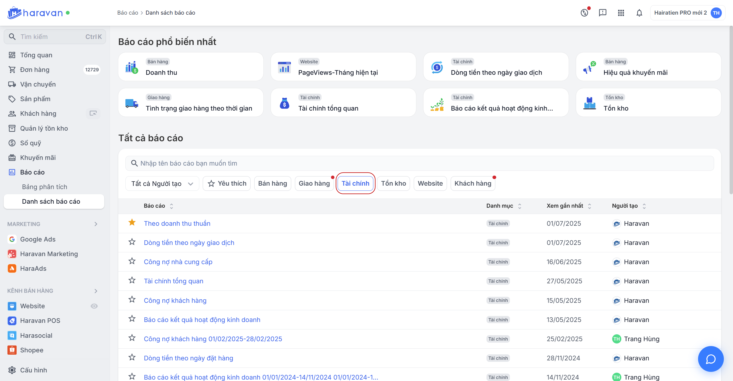 Báo cáo tài chính thể hiện thông tin về tình hình tài chính của nhà bán hàng. Báo cáo tài chính tại Haravan bao gồm các báo cáo như báo cáo lưu chuyển tiền tệ, báo cáo kết quả kinh doanh, cung cấp thông tin về doanh thu, chi phí, lợi nhuận, dòng tiền trong một khoảng thời gian nhất định.