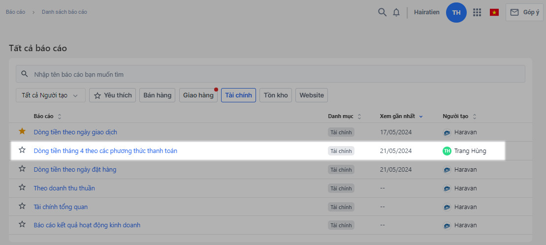 Haravan cung cấp 4 báo cáo tài chính mẫu để nhà bán hàng có thể tham khảo và tạo ra báo cáo phù hợp với nhu cầu kinh doanh của bạn