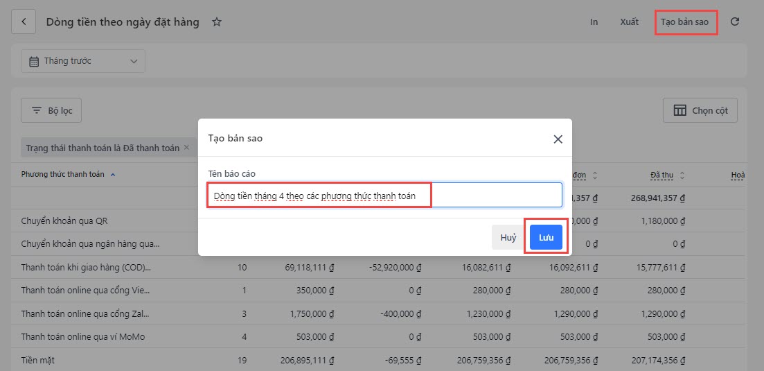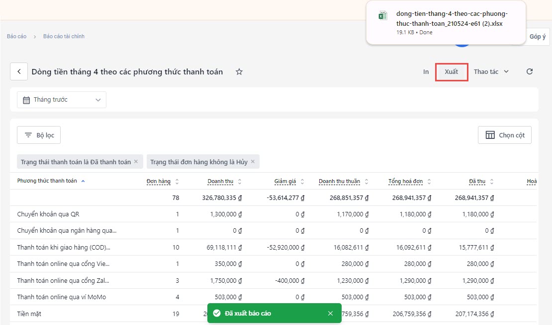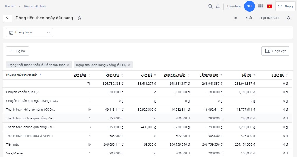 Chọn bộ lọc thời gian là Tháng trước, báo cáo sẽ thống kê dòng tiền trong tháng vừa qua theo các phương thức thanh toán trên đơn.