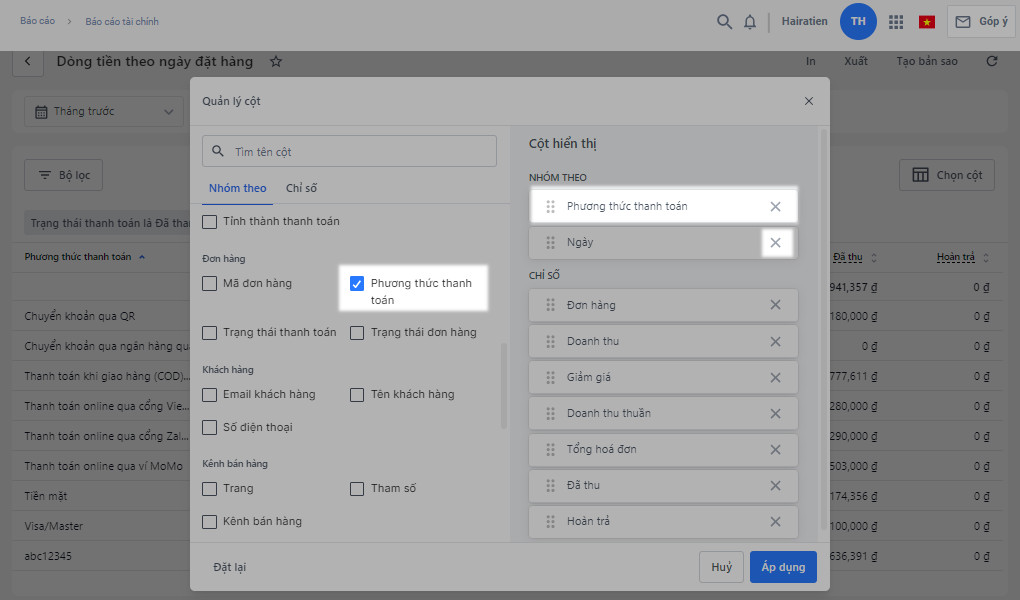 Tương tự như tính năng pivot trong excel, thao tác nhóm là một thao tác được sử dụng để nhóm các hàng dữ liệu lại với nhau dựa trên một hoặc nhiều cột dữ liệu chung. Ví dụbạn muốn thống kê dòng tiền theo các phương thức thanh toán trong tháng vừa qua. Bạn thực hiện chọn vào mục Chọn cột -> chọn thêm thông tin Phương thức thanh toá**n**vào bảng báo cáo và xóa thông tin ngày.