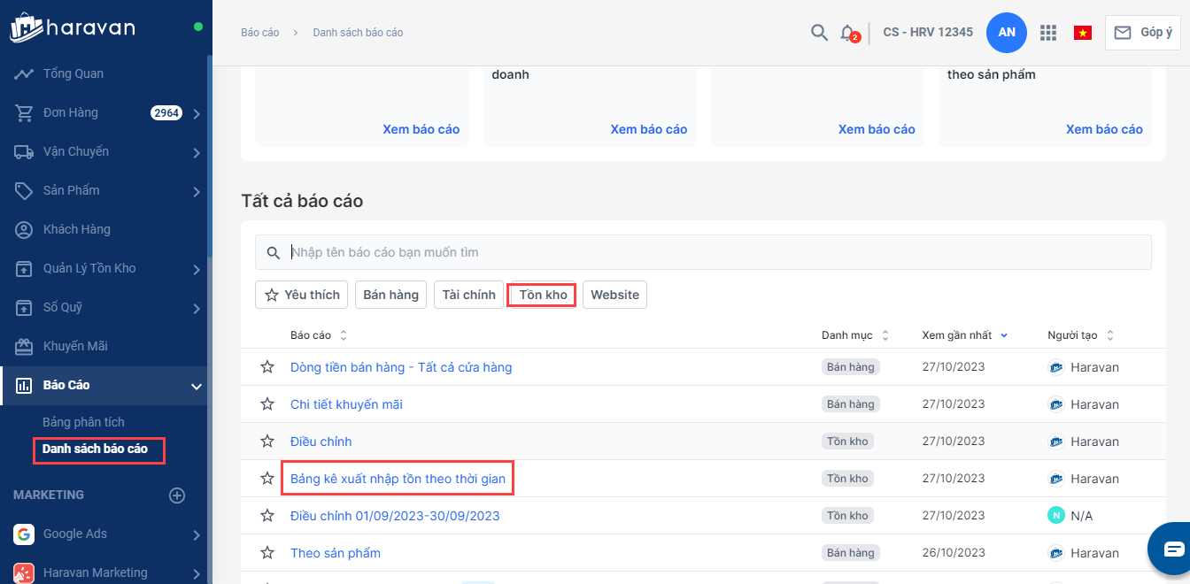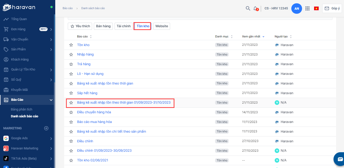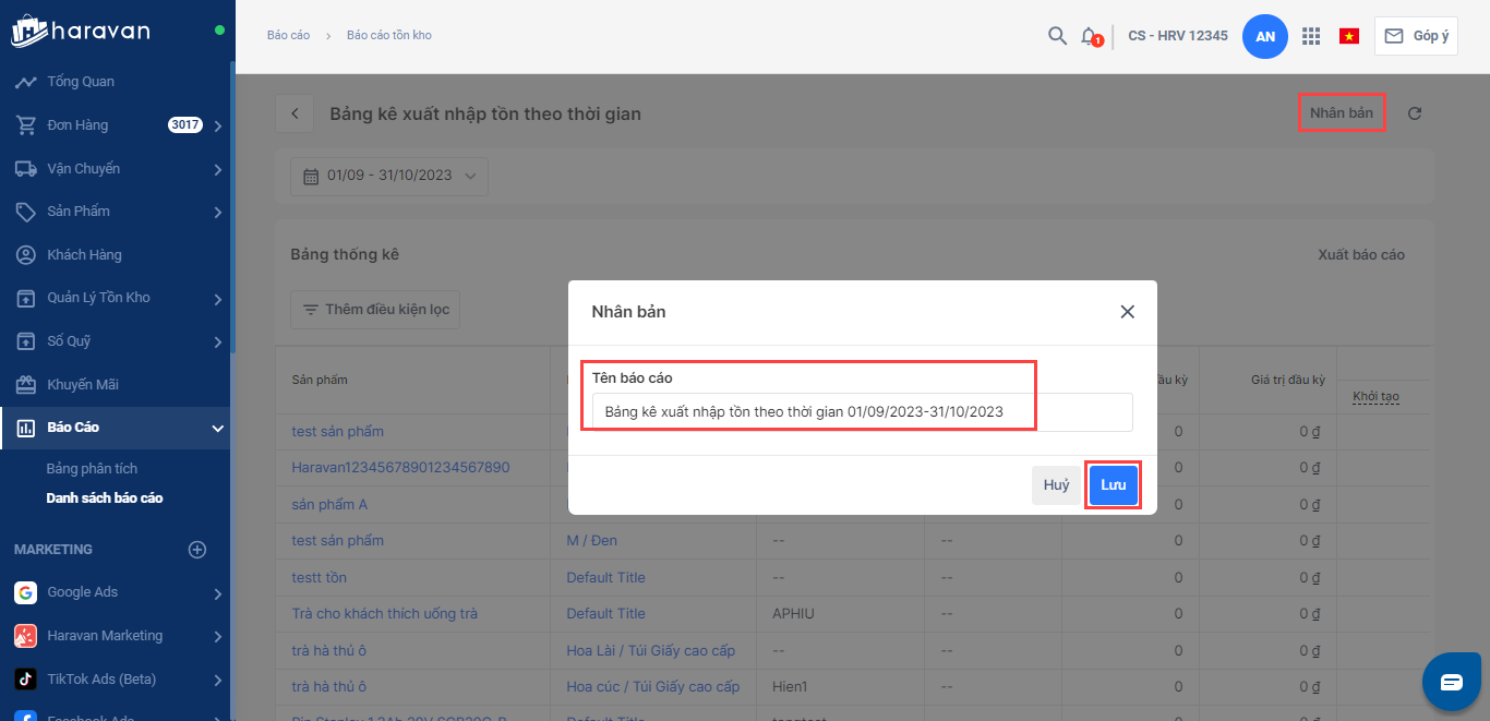 Bảng báo cáo mới nhân bản sẽ hiển thị trong mục báo cáo tồn kho