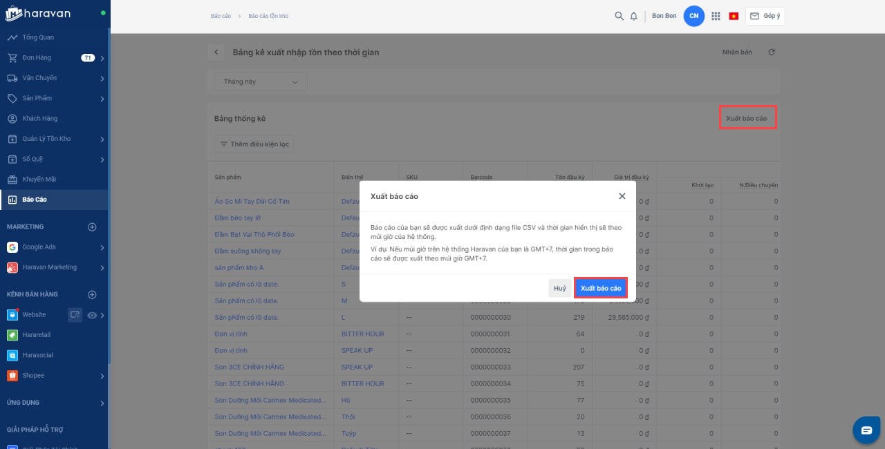 - Xuất file: File báo cáo sau khi xuất ra sẽ được gửi về email nhà bán hàng đang đăng nhập trên trang admin Haravan.