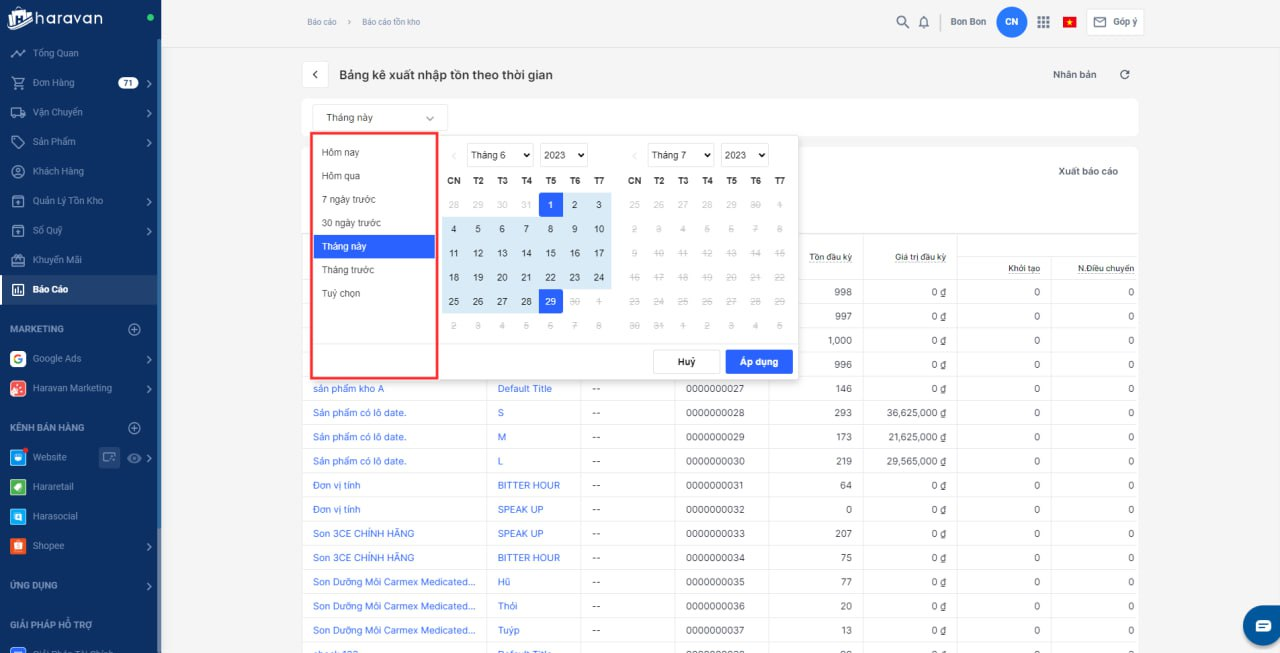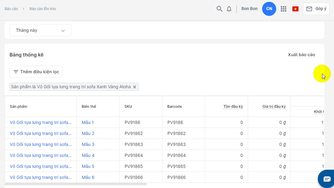 Ví dụ nhà bán hàng muốn xem số lượng tồn kho củasản phẩm Vỏ Gối tựa lưng trang trí sofa Xanh Vàng Aloha trong tháng này, bạn thực hiện lọc Vỏ Gối tựa lưng trang trí sofa Xanh Vàng Aloha , chọnthời gian lọc là Tháng này
