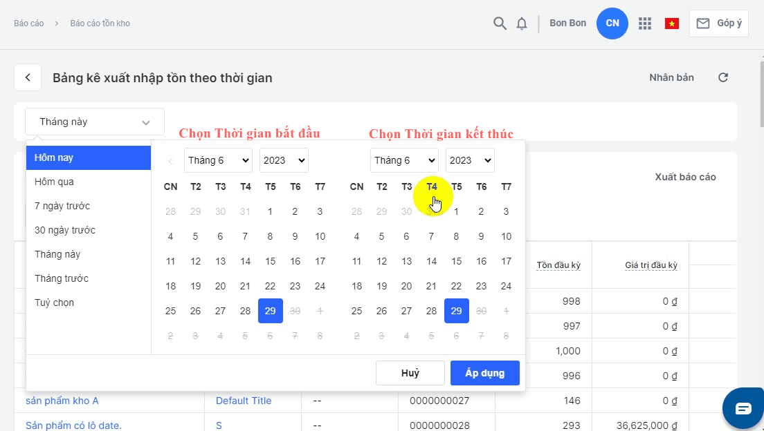 - Lọc báo cáo theo khoảng thời gian có sẵn