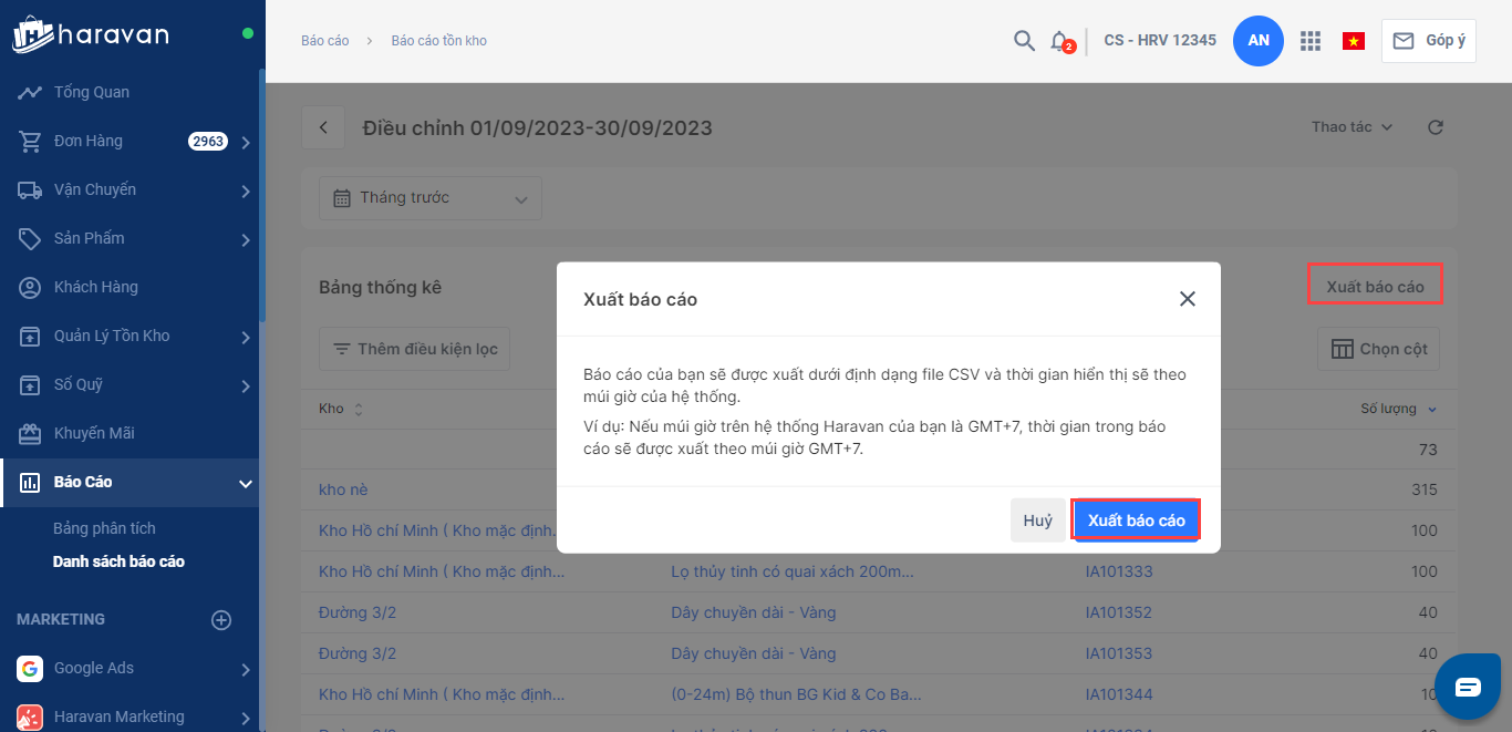 - Xuất file: File báo cáo sau khi xuất ra sẽ được gửi về email nhà bán hàng đang đăng nhập trên trang admin Haravan.