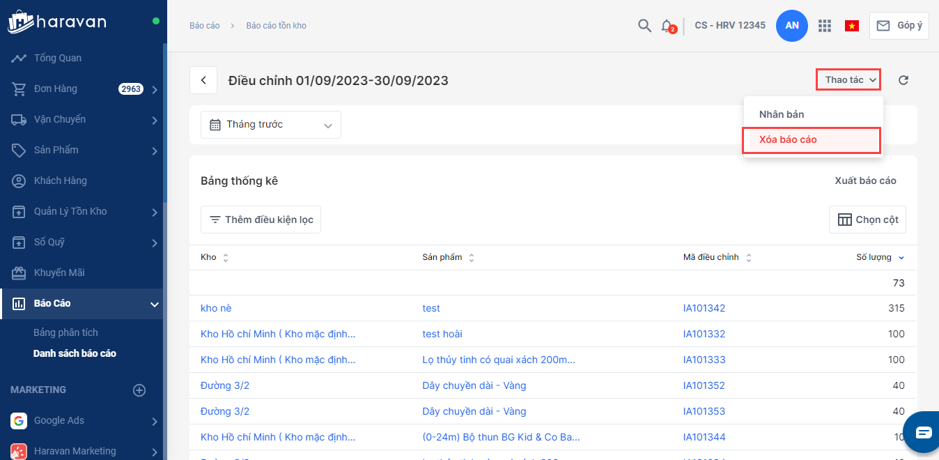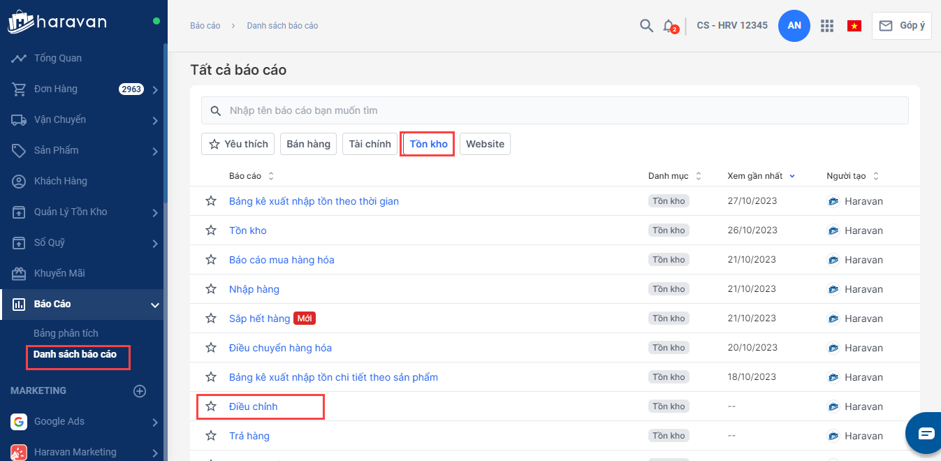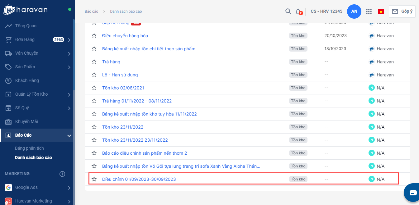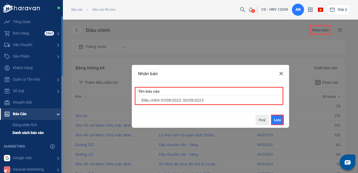 **Bảng báo cáo mới nhân bản sẽ hiển thị trong mục báo cáo Tồn kho