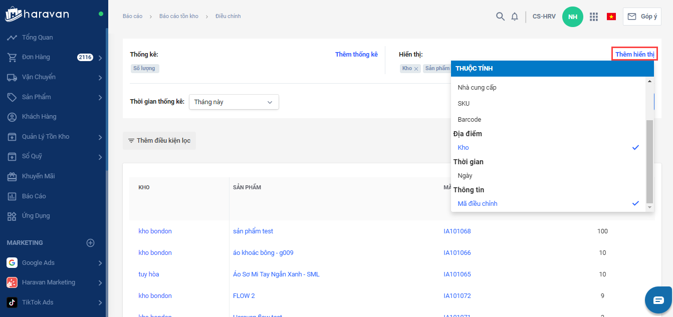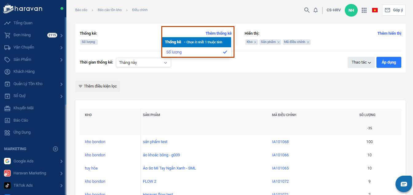 Báo cáo điều chỉnh hỗ trợ người bán theo dõi số sản phẩm điều chỉnh trong các kho sau thao tác kiểm kho hoặc kiểm kho nhanh.