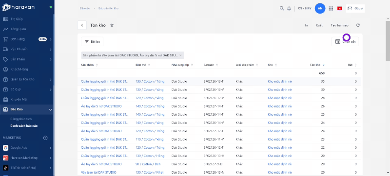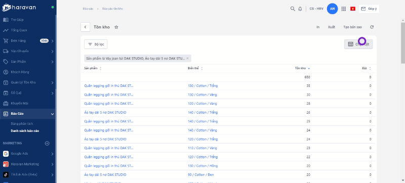 Báo cáo tồn kho chỉ có 4 cột thông tin: Tồn kho, Đặt, Khả dụng, Không khả dụng. Bạn có thể điều chỉnh để ẩn bớt cột thông tin trên báo cáo tùy theo nhu cầu của bạn.