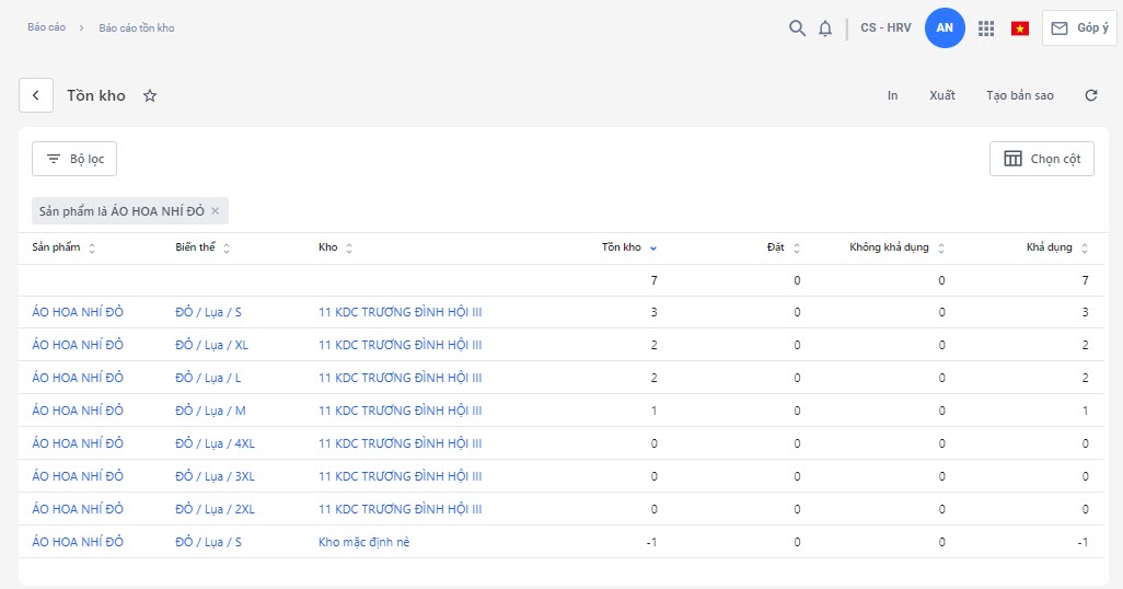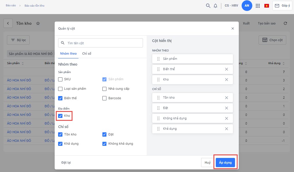 Ví dụ bạn muốn thống kê tồn kho của sản phẩm áo hoa nhí đỏ đang có ở các kho nào. Bạn thực hiện vào mục Chọn cột và chọn Kho -> chọn Áp dụng để hoàn tất.