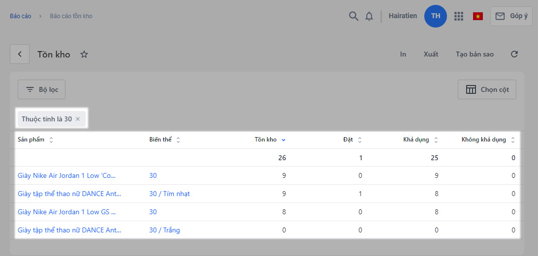 Ví dụ Bạn muốn xem tồn của sản phẩm giày có kích thước 30, bạn có thể lọc thuộc tính là 30.