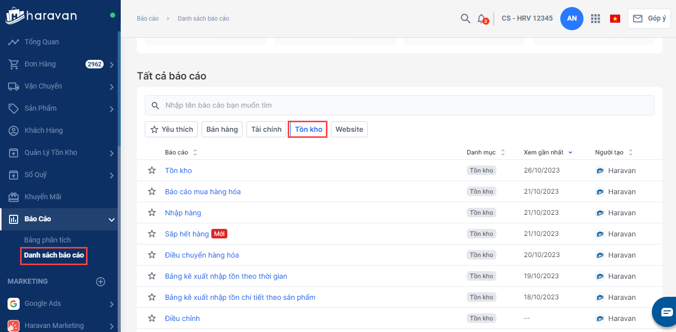 1.Tại mục Báo cáo, bạn chọn Danh sách báo cáo và chọnmục Tồn kho